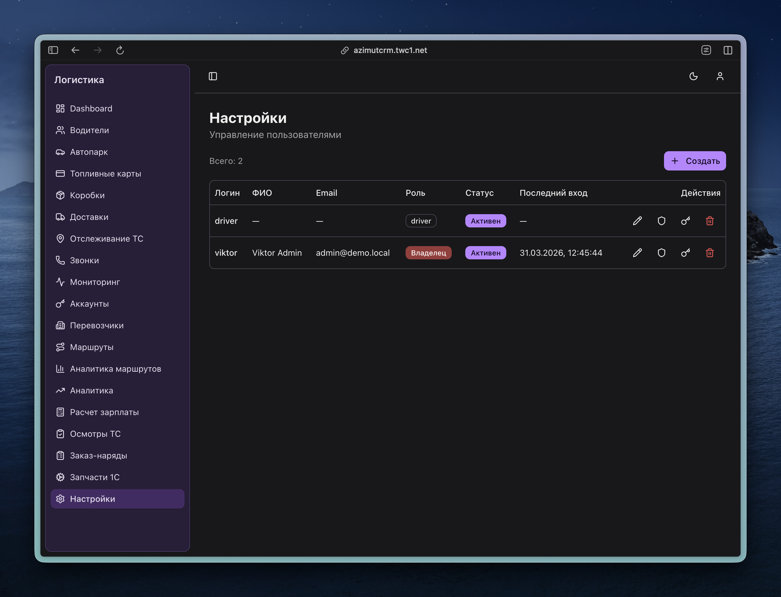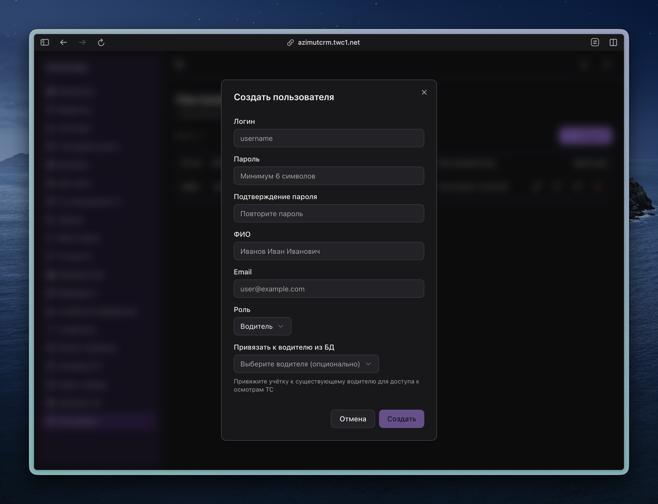Создание учётных записей — в CRM в настройках. Выберите роль и привяжите к водителю. Можно создать одну учётку для нескольких водителей.