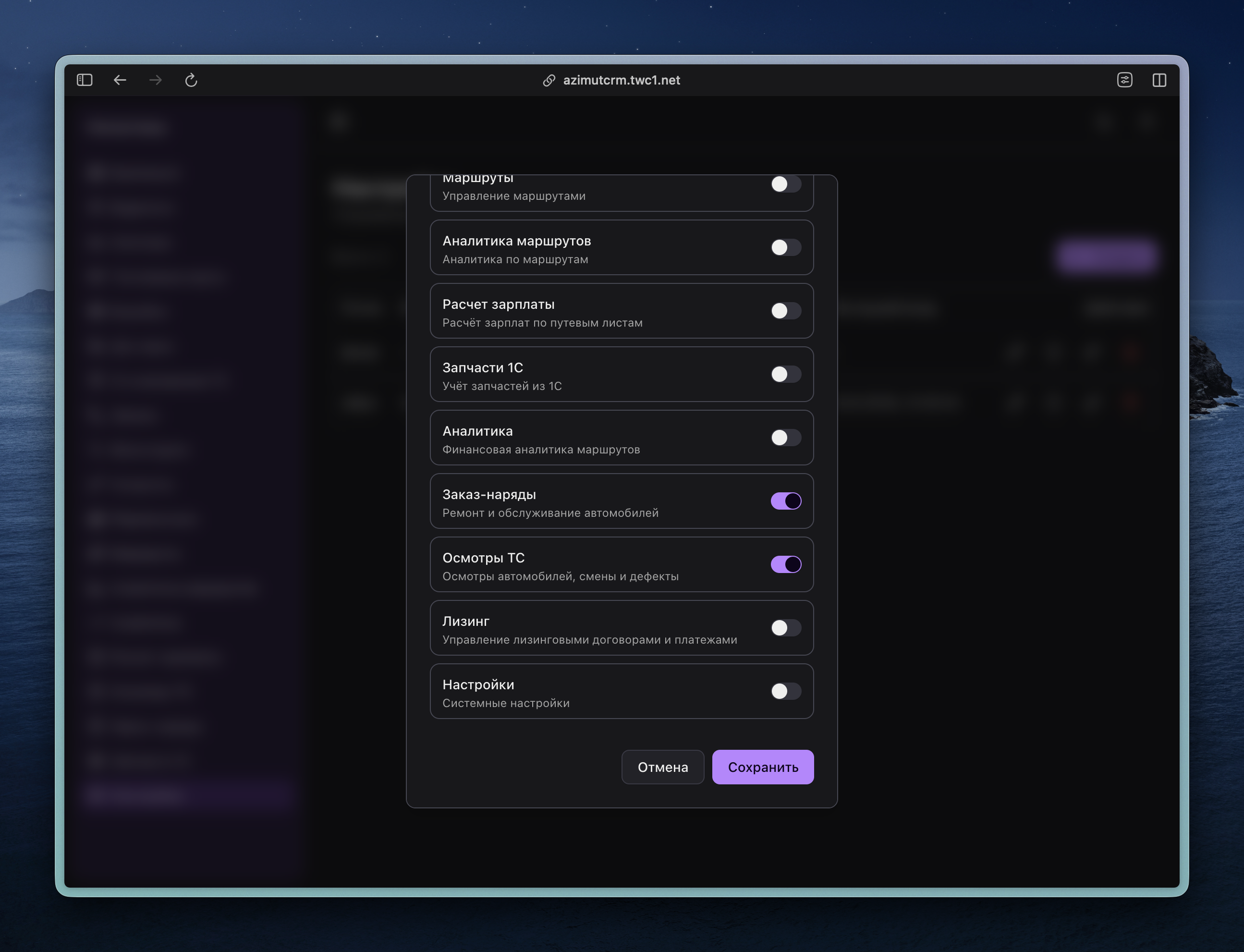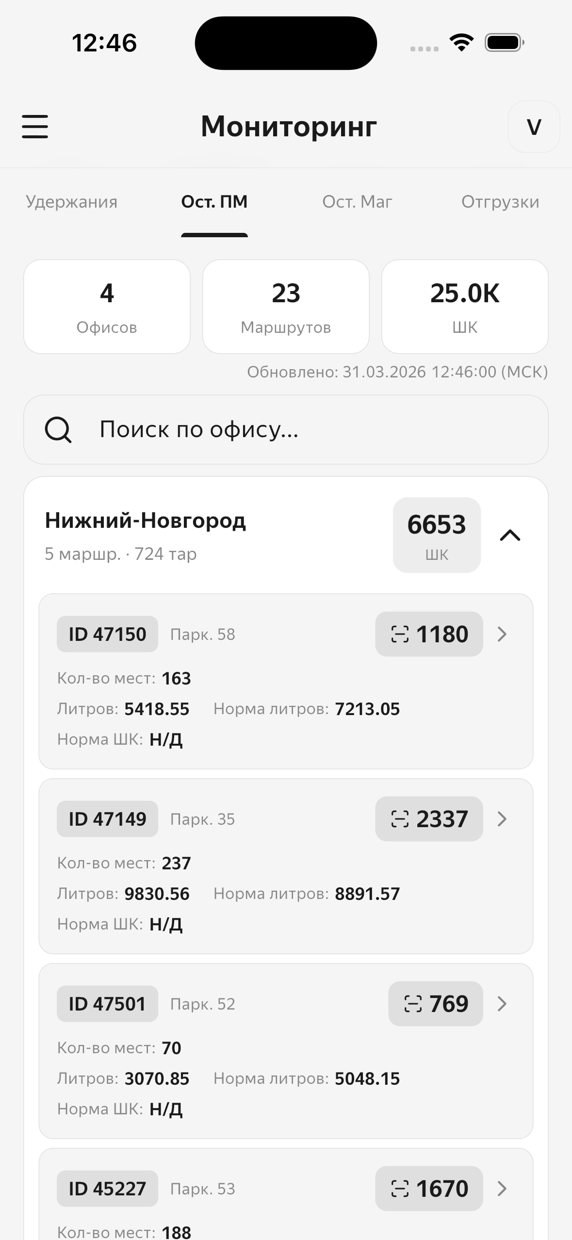 В зависимости от тарифа доступны: мониторинг, отгрузки, остатки ПМ, осмотры ТС и другие.